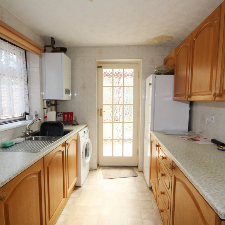 Kitchen 10’3 x 7’3 (3.14m x 2.22m): Double glazed window to side elevation, part tiled walls complimenting ample wall and base level units with worktops over, 1 and ½ bowl stainless steel sink unit, space for cooker with extractor hood over, plumbing for washing machine, wall mounted gas fired boiler, small paned door to: