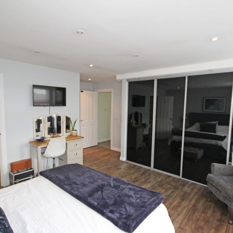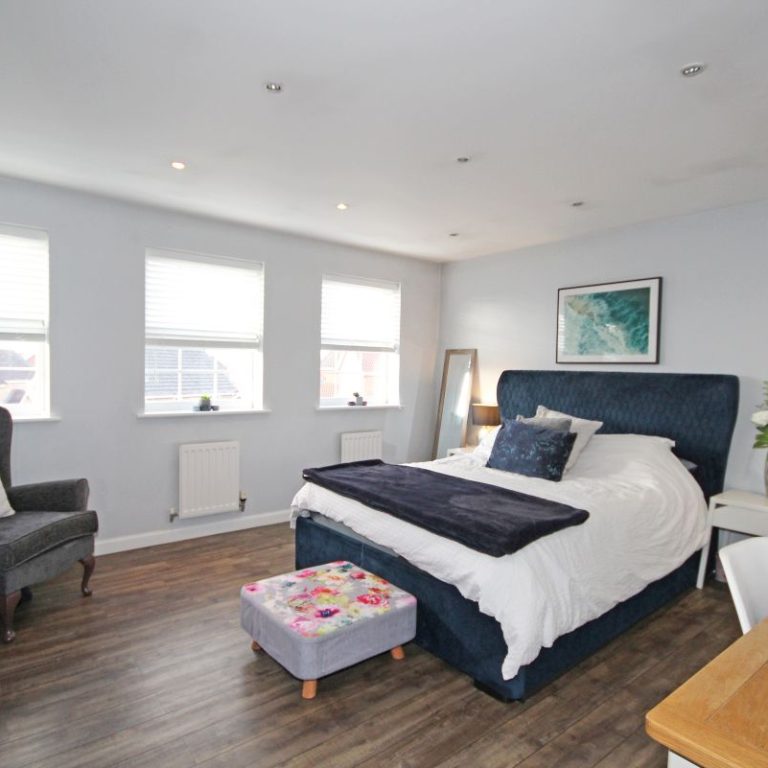 Bedroom One 15’5 x 13’0 (4.7m x 3.96m): Three windows to rear elevation, triple built in wardrobe, built in storage cupboard, two radiators, wood effect flooring, doors to:
