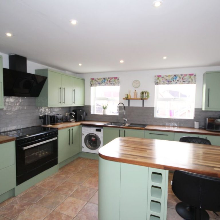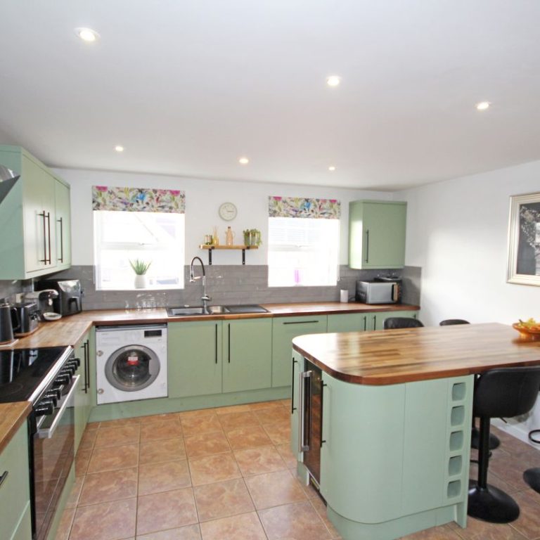 Kitchen/Breakfast Room 15’7 x 13’1 (4.75m x 3.99m): Two windows to rear elevation, part tiled walls complementing ample wall and base level units with wooden worktops over, 1 ½ bowl sink with mixer tap, range style cooker with extractor fan over, integral washing machine and dishwasher breakfast bar, tiled flooring, radiator, wall mounted gas fired boiler.