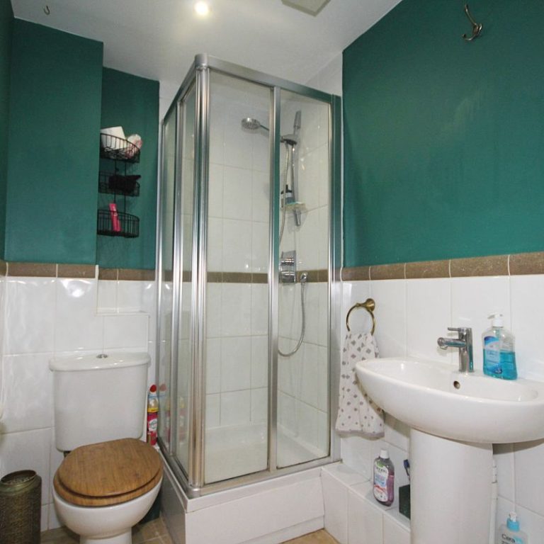 Shower room: Part tiled walls, enclosed shower, pedestal hand wash basin, low level W/C, underfloor heating.