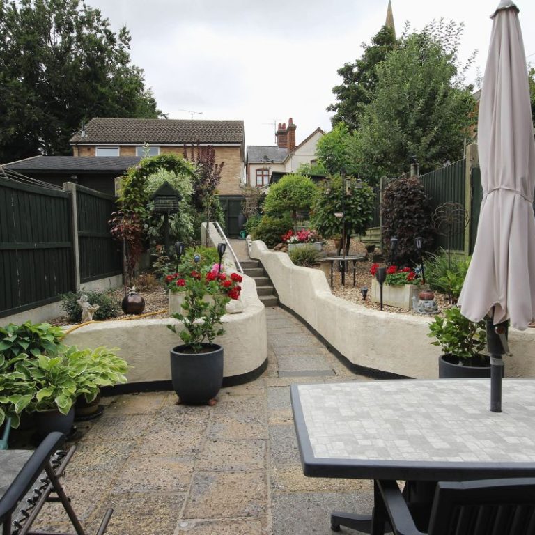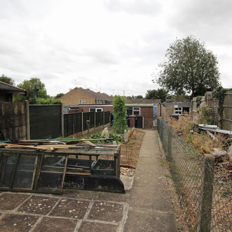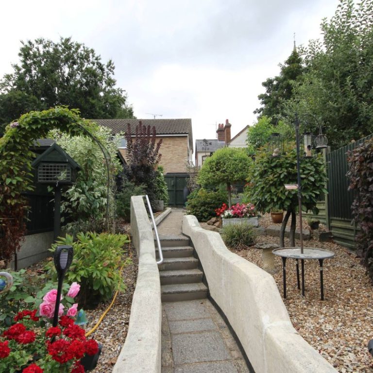 The rear garden offers a charming and functional outdoor space, featuring a paved patio area and walkway, bordered by well-established flower beds, all enclosed by timber fencing for added privacy. The garden extends around the corner, providing additional space ideal for a kitchen vegetable garden, extra storage, or further landscaping opportunities. At the far end, a single garage is conveniently positioned, with additional parking available directly in front with gated rear pedestrian access.