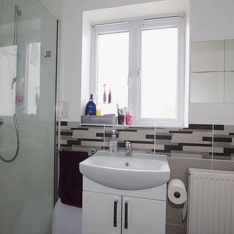 En-Suite Shower Room: Obscure UPVC double glazed window to rear elevation, extractor fan, part tiled walls with white suite comprising low level WC, vanity wash hand basin with mixer tap and cupboard beneath, tiled shower cubical with fitted shower and splash screen, radiator.