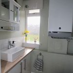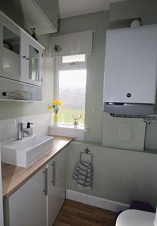 Refitted WC: Window to front elevation, fitted with two piece suite comprising and vanity wash hand basin with mixer tap and tiled splashbacks, low level WC, wall mounted gas boiler.