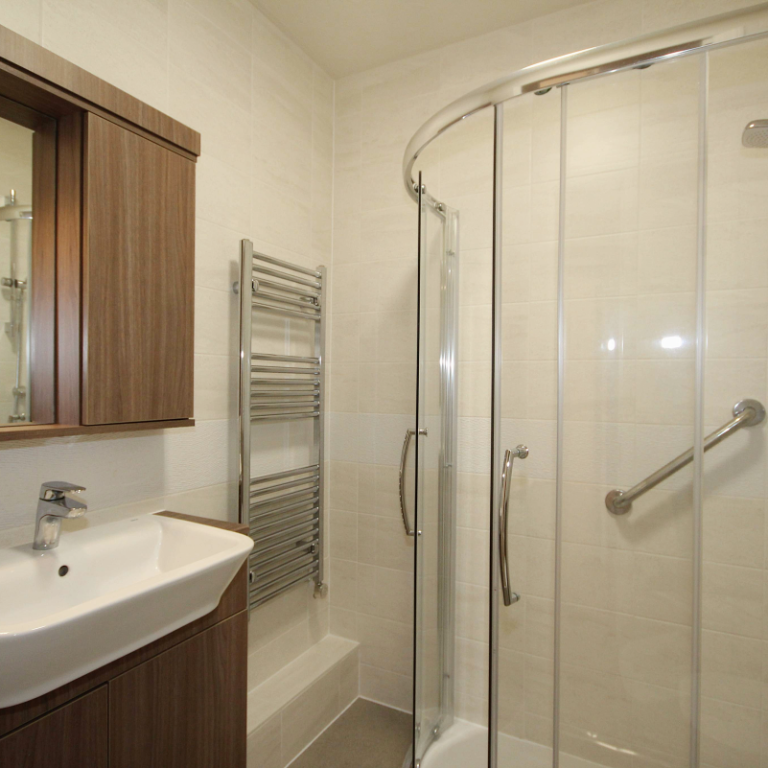 Shower Room: Humidistat extractor fan, low level WC with concealed cistern, vanity wash hand basin with cupboard beneath and mirrored unit above, tiled shower cubical housing mains powered thermostatic shower, electric thermostatic ladder radiator.